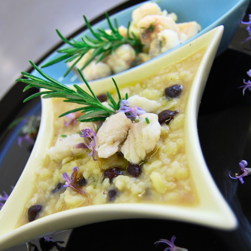 La sera precedente mettere in ammollo i ceci neri in acqua con poco bicarbonato. L’indomani scolarli, sciacquarli e cuocerli in pentola con acqua fredda, alloro, uno spicchio d’aglio, uno scalogno e un rametto di rosmarino, lasciando sobbollire per circa due ore, finché risulteranno cedevoli. Pulire la pescatrice separando la coda dalla testa e con quest’ultima preparare un fumetto molto aromatico (vedi ricetta a p. 49). Dopo mezz’ora di cottura, prelevare la coda, tenerla da parte e proseguire l’ebollizione del fumetto. Filtrare, regolare di sale e mantenerlo in ebollizione. Tostare la fregola in casseruola con poco olio, bagnare con il fumetto e cuocere per 15-20 minuti. Verso f ine cottura aggiungere i ceci neri e la polpa della coda di pescatrice deliscata, lasciare insaporire per qualche minuto e spegnere il fuoco. Lasciare riposare la minestra per 5 minuti affinché acquisti maggiore densità, mantecare con olio al rosmarino (vedi ricetta a p. 55), decorare con rametti di rosmarino e servire.
