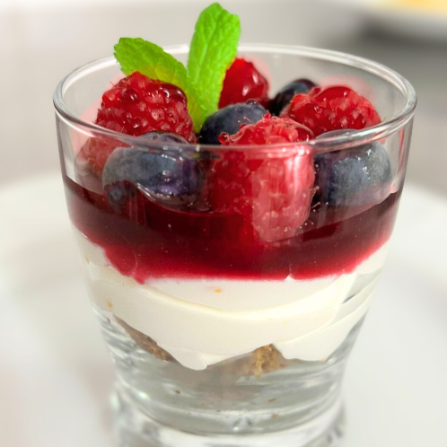 Comporre i bicchierini versando sul fondo uno strato di crumble, quindi distribuire la mousse di mascarpone fino a un dito dal bordo. Completare con un sottile strato di coulis di lamponi e decorare con frutti di bosco interi. Rifinire con qualche fogliolina di menta fresca e servire il dessert ben freddo.